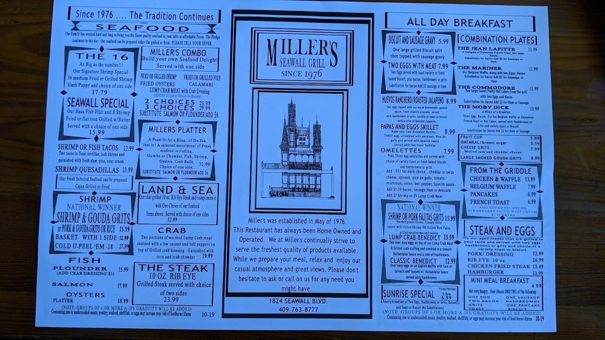 Welcome to Miller's Seawall Grill, a beloved dining gem nestled along Galveston's scenic coastline. Renowned for its delicious home-style cooking, this restaurant offers an expansive menu that caters to all tastes. Whether you're craving crispy fried shrimp, flavorful crab cakes, or the crowd-pleasing shrimp and grits, every dish celebrates the freshness of coastal cuisine.